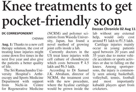 Cartilage cells grown in 3D culture- Novel solution for sports and traumatic knee injuries; Published in Journal of Orthopedics |