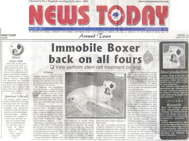 NCRM and TANUVAS jointly start Stem Cell work in Veterinary Spinal Cord Injuries. Rambo walks the Headlines