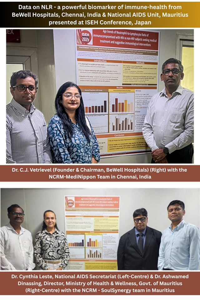 The study was undertaken taking advice from collaborating institutes from Japan where adoptive NK cell and T cell-based immune therapies are in clinical practice for more than two decades to manage cancer and help in anti-aging. The data presented in ISEH included two groups: immune-competent individuals and immunocompromised individuals (HIV-positive patients) taking the support from Dr. Woodun & Dr. Leste of the HIV Unit- Mauritius & staff of Nichi-In Centre for Regenerative Medicine (NCRM) – MediNippon Alliance whose new cell processing facility has been set up in Mauritius in collaboration with SoulSynergy, Mauritius. The data of HIV+ve patients revealed that NLR peaked between the ages 20-29 in HIV positive patients in Mauritius and remained persistently high thereafter in people living with HIV (PLWHIV). This highlights early immune dysregulation in this population and underscores the urgent need for early and targeted immune interventions in HIV care, according to Dr. Cynthia Leste, whose team headed by Dr. Woodun was lauded by Dr. Ashwamed Dinassing, Director of Health, Mauritius for their contribution to science in the domain of Immunology. It is to be noted that Dr. Ashwamed Dinassing visited Japan in 2022-2023 to have interactions in person with the regulatory team of Ministry of Health & Labour Welfare (MHLW), Government of Japan to understand their Act on Safety of Regenerative Medicine enacted in 2014 which regulates the cell based therapies in Japan.
