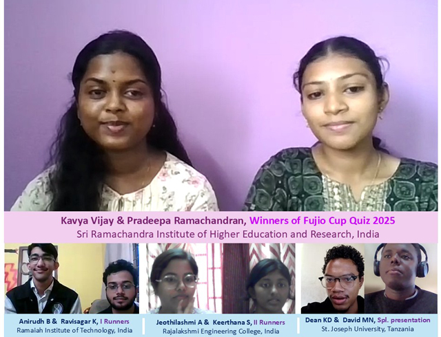 Chennai, 13th October, 2025: Kavya V and Pradeepa R from Sri Ramachandra Institute of Higher Education and Research, India won the 20th Anniversary edition of the Fujio Cup Quiz (FCQ), marking the institute’s second consecutive championship in this prestigious international active knowledge gaining (AKG) event in the field of stem cells and regenerative medicine. Ravisagar K and Anirudh Bantwal Baliga from Ramaiah Institute of Technology, India emerged as Runner-up while Keerthana S & Jeothilashmi A from Rajalakshmi Engineering College showcased strong performance in the finals of the FCQ 2025. A special presentation by David Maximillian Nsemiwe & Dean Khang Dang of St. Joseph University, Tanzania highlighted the prevalence of Corneal Blindness & Eye-Bank Services in Africa with Special Emphasis on Tanzania.