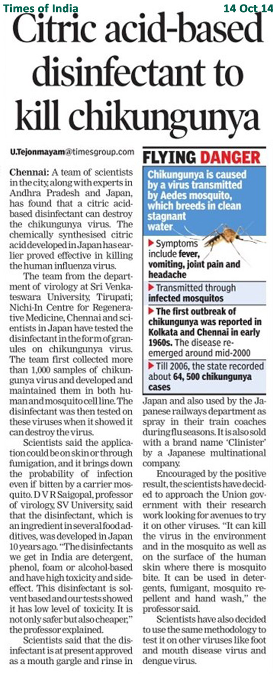 Sri Venkateswara University & Japanese Team prove the efficacy of Citric Acid based granules against Chickungunya virus |