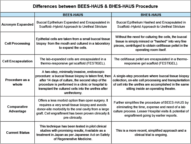BHES-HAUS (Buccal Epithelium Hashed and Encapsulated in Scaffold – Hybrid Approach to Urethral Stricture) is a simplified adaptation of the BEES-HAUS (Buccal Epithelium Expanded and Encapsulated in Scaffold – Hybrid Approach to Urethral Stricture) method. Both techniques aim to engraft buccal mucosal epithelial cells from the patient onto the urethrotomy wound site, which after Direct Visual Internal Urethrotomy (DVIU) is otherwise left to heal naturally, often leading to recurrence. In the BEES-HAUS method, in-vitro cultured buccal epithelial cells are transplanted after expansion, which has already demonstrated successful epithelial engraftment in preclinical studies and promising outcome in a clinical study.